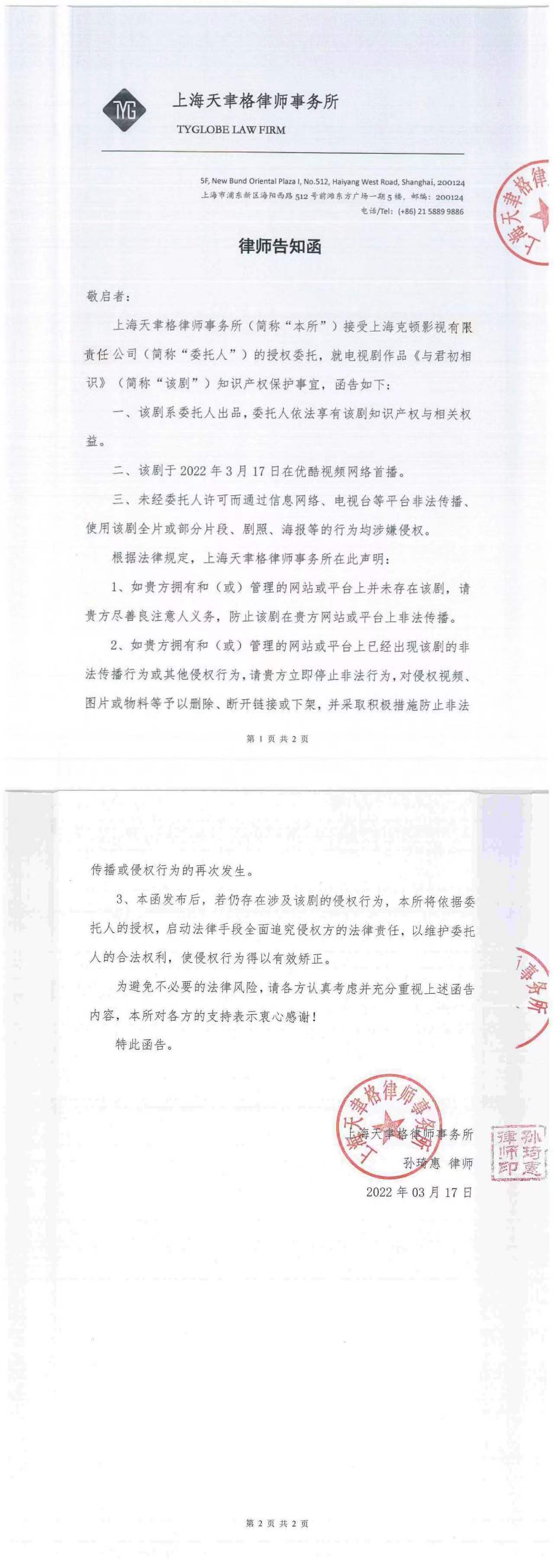 天聿格娱乐法为电视剧《与君初相识》提供全程法律服务,我们特别提醒各视频平台、新媒体网站、电商网站等相关主体,未经权利人许可而通过信息网络、电视台等平台非法传播该剧全片或部分片段、剧照和海报等的行为均涉嫌侵权,如发现任何非法传播行为或其他侵权行为,本所会启动法律手段全面追究侵权方的法律责任。