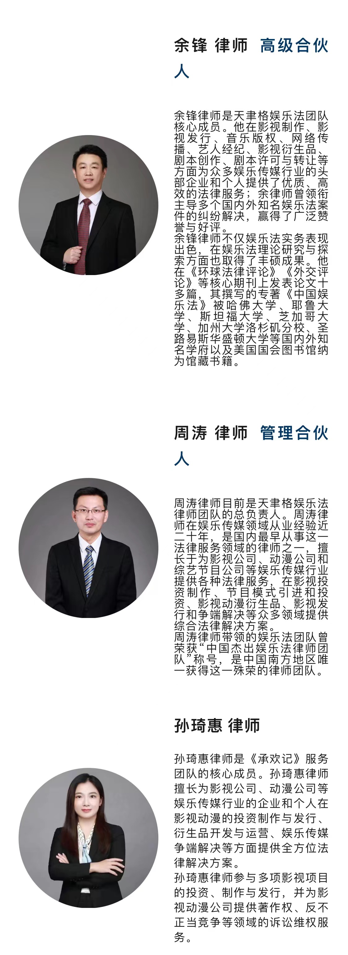 作为法律顾问,天聿格娱乐法团队为影视剧出品方、版权人提供全案法律服务,包括作品专属IP建构、IP投资与风险管控、摄制知产风险咨询、演艺经纪、发行等全方位法律服务,日常工作包括起草、审阅及修订电视剧投资、制作、宣传发行相关协议文件,为出品方、版权人提供法律问题咨询等一系列综合服务。