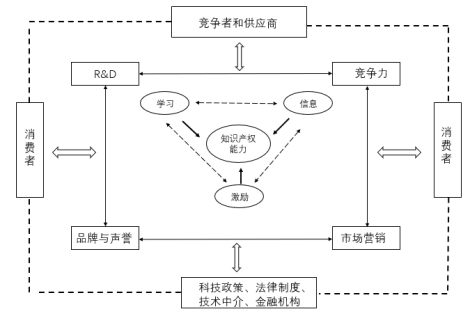 The collaborative application capability of intellectual property rights essentially represents the capacity to scientifically and effectively respond to policy controls. Policy controls primarily involve implementing measures to regulate international treaties such as those governing technology transactions, often through referencing and applying specific international intellectual property rules. Such controls may significantly impact national industrial security. Industries with intellectual property rights typically possess extended industrial chains, and their innovation ecosystems encompass multiple components including participants, innovation rights, and socio-economic environments. To effectively address intellectual property trade barriers, enterprises should prioritize continuous enhancement of their capabilities. By building collaborative IP application capabilities through innovation ecosystems (see Figure 1), they should strategically position industrial clusters with competitive advantages and vigorously develop national/regional innovation ecosystem capabilities. From the perspective of innovation ecosystems, externally, this involves comprehensive coverage of industry leaders and patent alliance managers. Internally, it requires deeper R&D initiatives supported by industrial and manufacturing systems.
